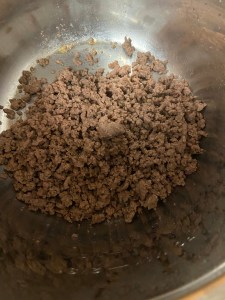 - Take raw meat add to instapot and turn instapot on sauté. It has an auto time set for 30 minutes depending on the amount of meat may be done before then. Use a spatula or large spoon to stir meat and break up to ensure it is cooked thoroughly and browned all over.