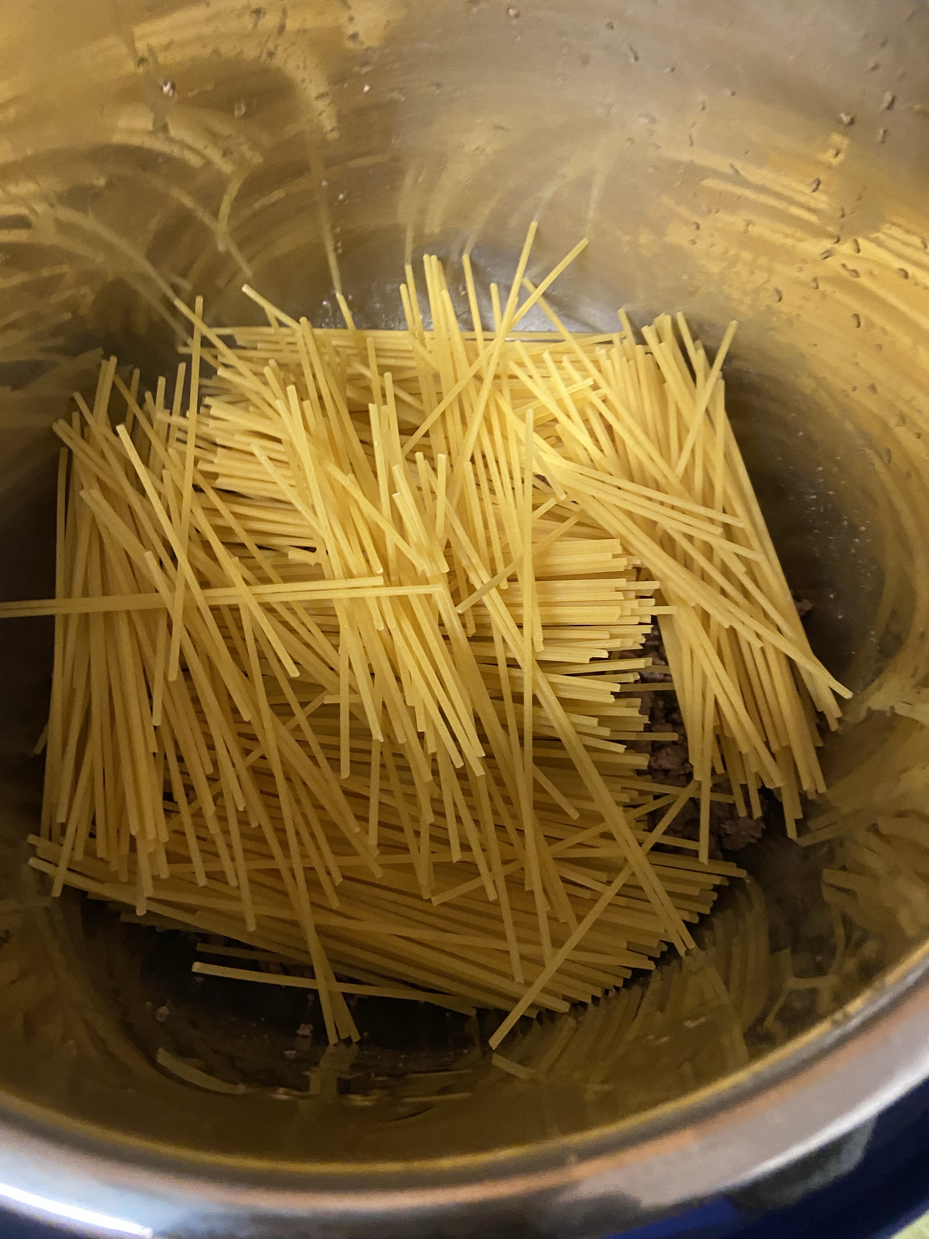 - Add noodles. Break in half if needed to fit in pot as you want them to lay flatly across the meat not sticking up.