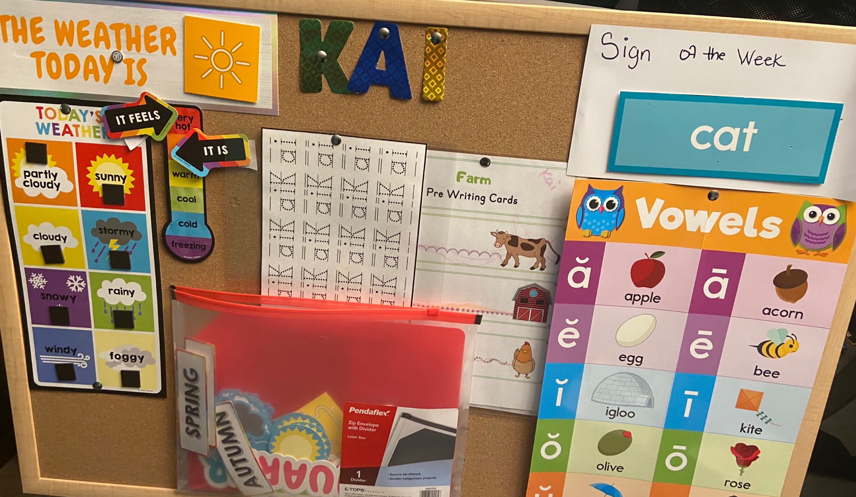 The basics I wanted to teach I highlighted on the poster board and items I could change out I added to the cork board. Simply put he needs to learn his ABC’s and numbers. But let’s try the seasons, determine the weather, days of the week, understanding our left from our right and of coarse our feelings. I’ve linked where I was able to locate all these items and some website that provide free printables as well because you can’t have too many things to let little kids write and color on.